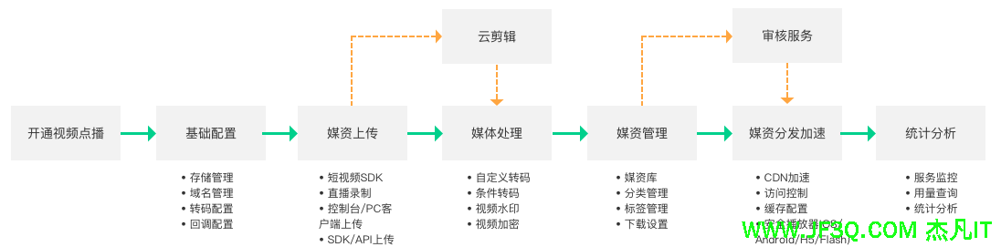 - 直播转点播:将直播流同步录制为点播视频,用于回看。并支持媒资管理、媒体处理(转码及内容审核/智能首图等AI处理)、内容制作(云剪辑)、CDN分发加速等一系列操作。