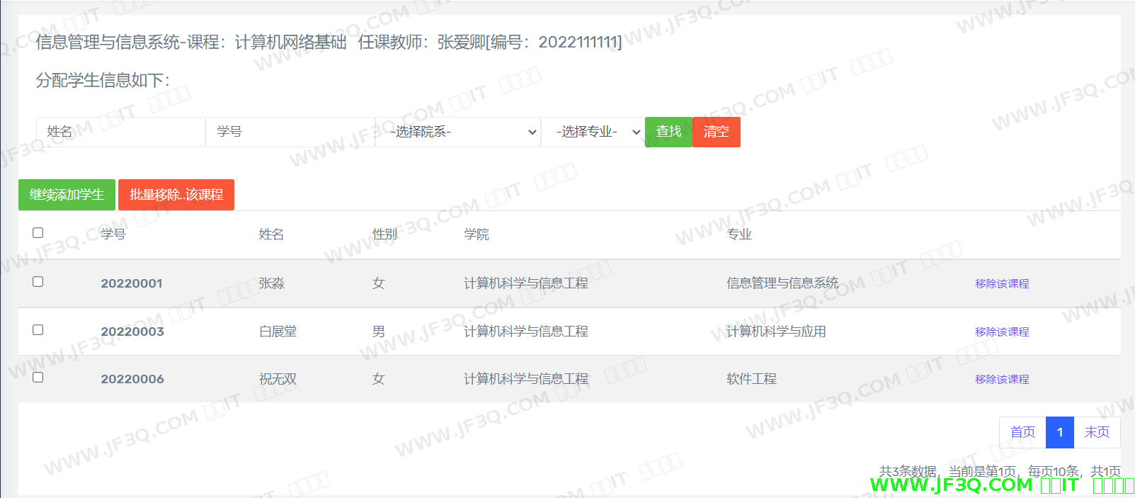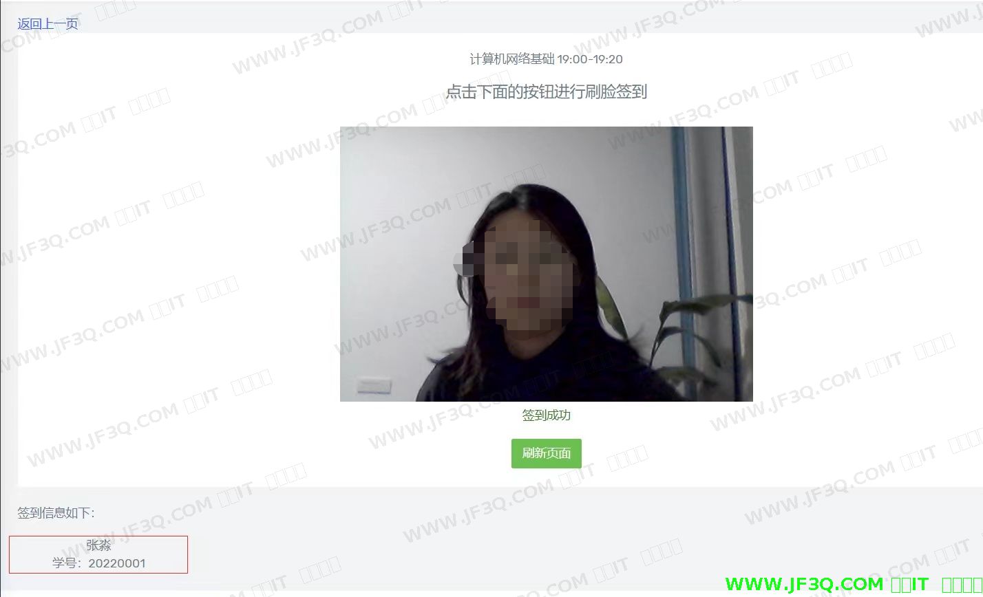 根据识别对象的不同,重新增添一名新学生的外貌特征值,根据常规考勤流程,测试在不同对象的主题下,人脸识别签到的完善性。在“计算机网络基础”课程里,分配三名学生进行课程学习。现将采集计算机科学与应用专业的“祝无双”同学的人脸信息,进行课堂签到测试。