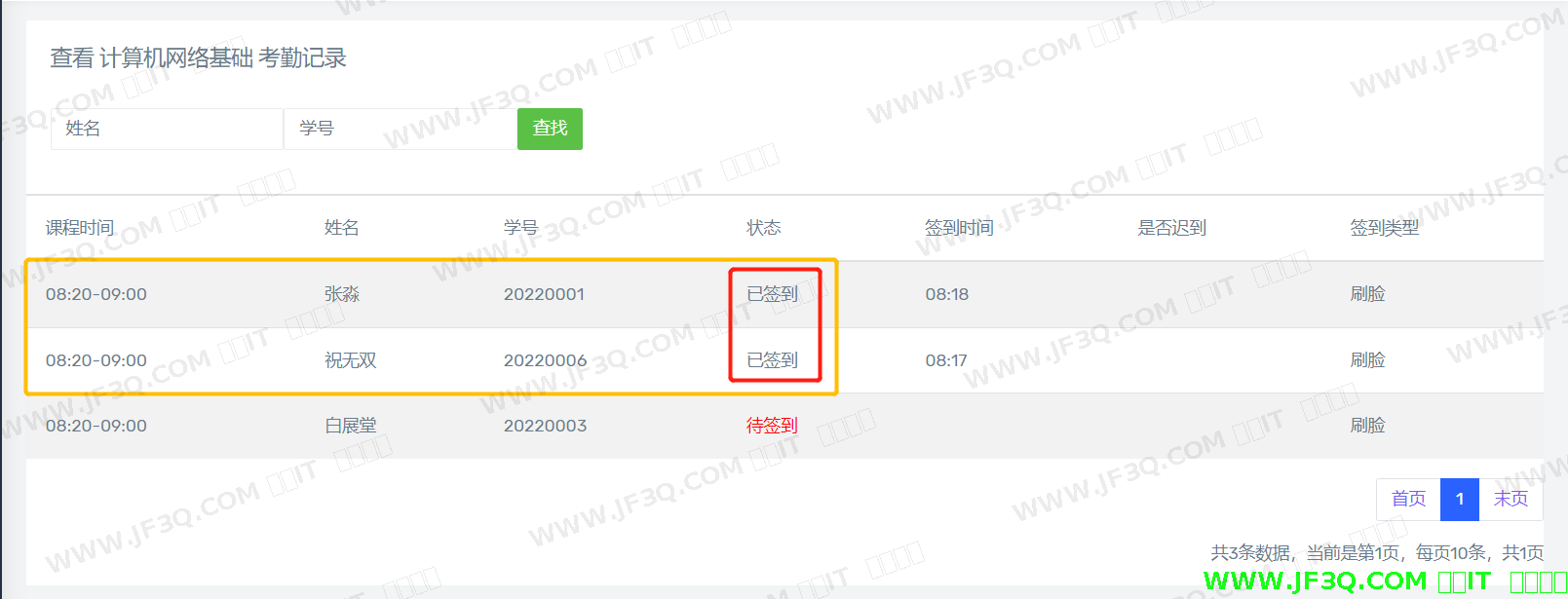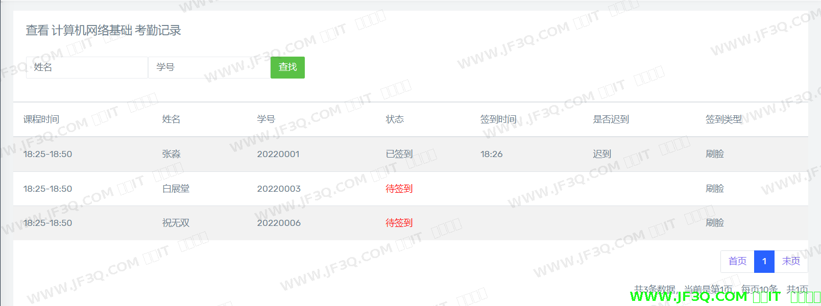 任课老师同样可以在教师端查看本节课程签到的详细内容(为方便测试,本节课程共分配了三名学生),根据状态栏,可以直接明了的看到考勤结果。未打卡的学生签到状态栏里标注红色“待签到”字样,以便教师分辨。教师端考勤记录如图5-6所示。