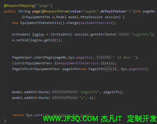 请求路径/web/equipmentFee/page,调用WebSreEquipmentFeeController.page(),根据session获取当前登录学生的id,调用equipmentFeeService.list()获取该学生的设备使用的记录,使用pagehelper插件分页。代码如下: