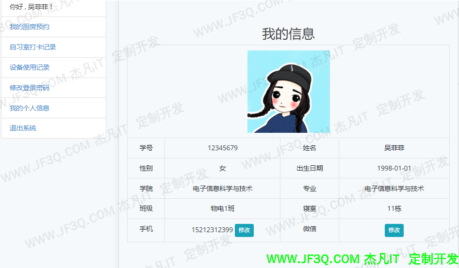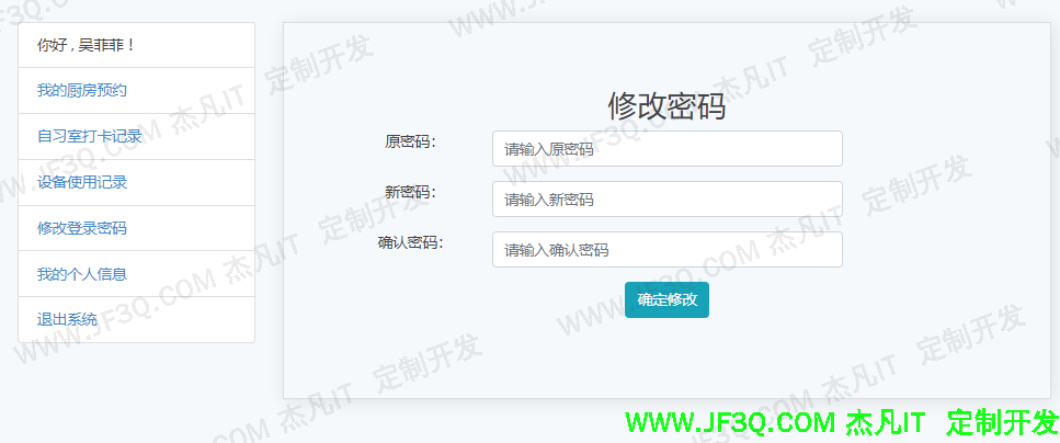 学生个人中心主要功能有:我的预约厨房、自习室打卡记录、设备使用记录、修改登录密码、我的个人信息、修改密码、退出登录。