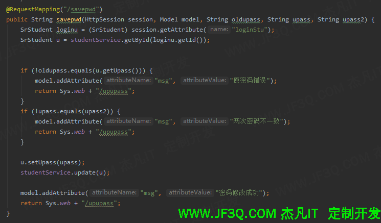 学生点击提交,表单请求路径/web/student/savepwd,进入WebSrStudentController.savepwd()方法,根据session获取当前登陆的学生id,获取他的原密码对比输入是否正确。然后判断新密码是否一直,调用studentService.update()更新学生密码。代码如下: