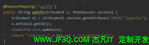 学生也可以点击修改按钮单个修改自己的微信电话等。请求路径/student/upinfo?n字段属性=s值,进入WebSrStudent.upinfo()方法,根据session获取当前登陆的学生id,调用studentService.update()更新对应的字段 ,代码如下: