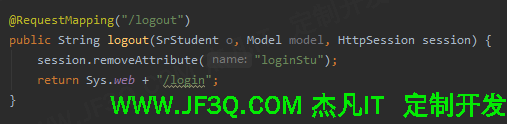 学生点击退出登录按钮,页面将跳入登录页面,请求路径/web/student/logout,进入WebSrStudentController.logout()方法,移除session里的学生实体,代码如下: