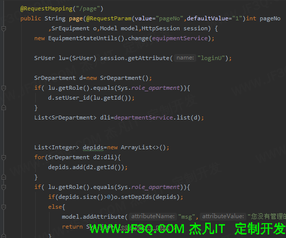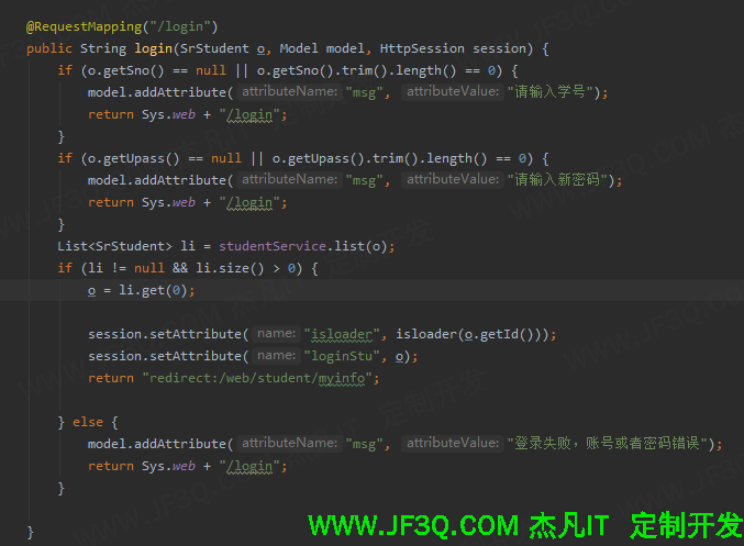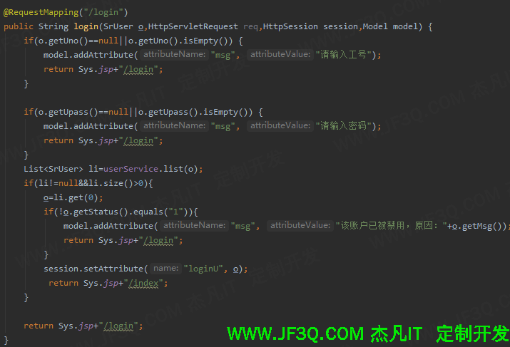 输入管理员账号和密码,进入SrUsersController.login(),调用usersService.list()查询工号和密码,根据结果是否为空来判断是否能登录,并把成功登录的user数据存入session,代码如下: