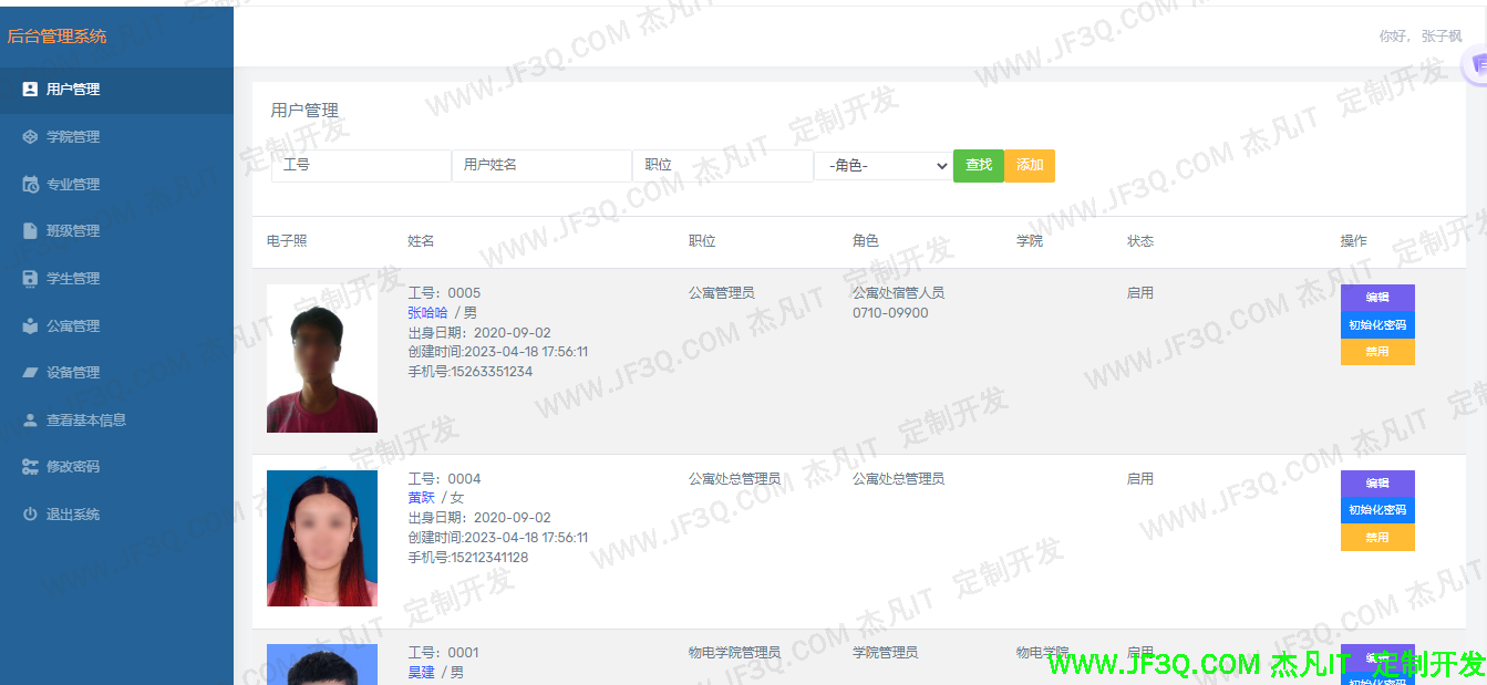 管理员可对用户进行添加、查询、编辑、禁用、启用账号、初始化密码。页面如下: