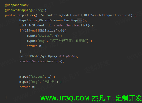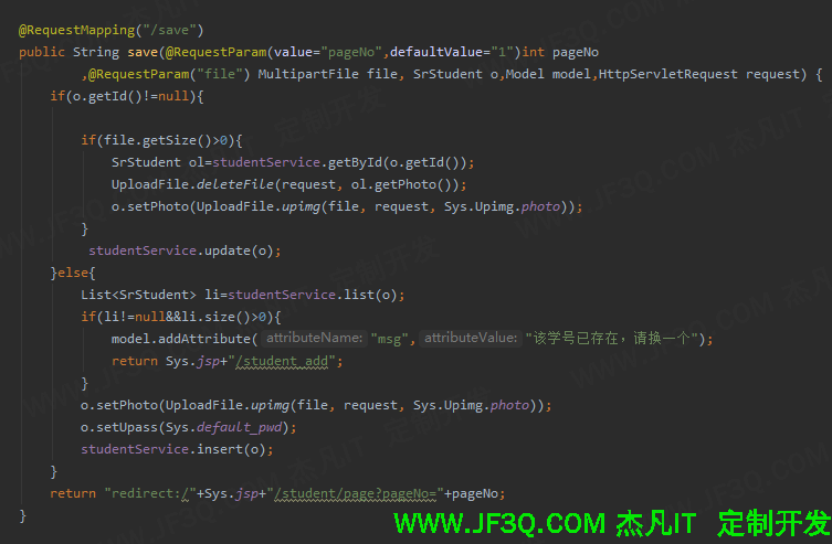 当表单提交请求/jsp/student/save,根基id是否为null,判断当前是添加还是编辑操作。Id为空表示添加,不为空表示更新,同时还要判断学号唯一性,代码如下: