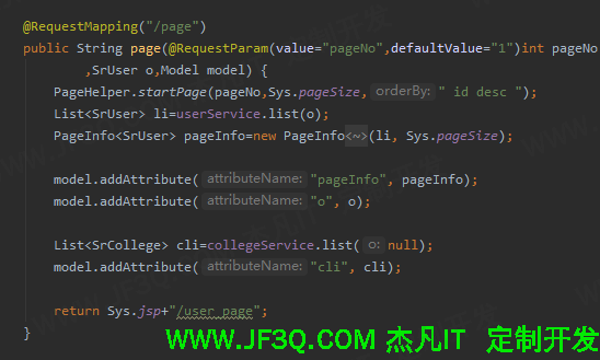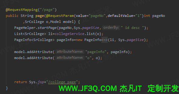 调用collegeController.page()使用collegeService.list()进行查询,使用pageHelper插件分页,代码如下: