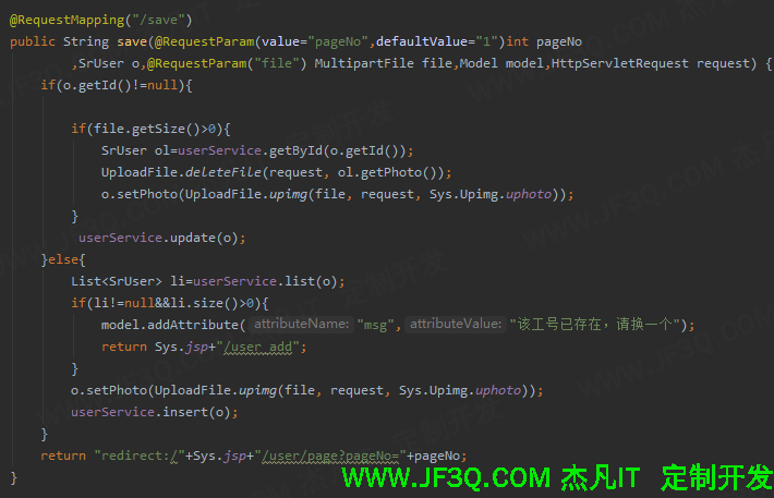 由于工号是登录使用,必须保持其唯一性,当表单提交请求/jsp/user/save,根基id是否为null,判断当前是添加还是编辑操作。Id为空表示添加,不为空表示更新,代码如下: