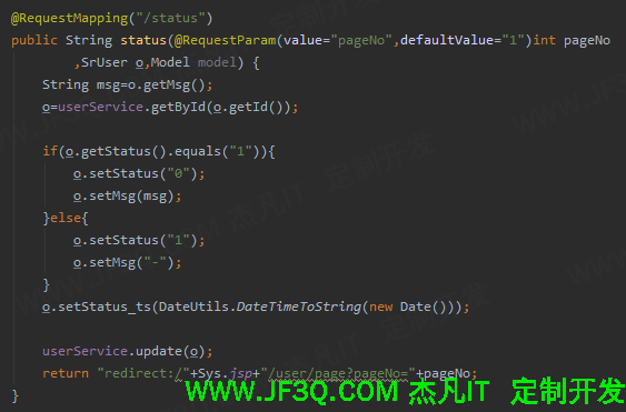 为了方便管理员管理用户,可对账号进行禁用启用操作。禁用的账号将不可以登录该系统。使用status标识,1表示账号正常,0表示已禁用。代码如下: