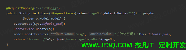 为了防止由用户忘记密码,设计了初始化密码的功能,管理员点击后会将该用户的密码初始化为123456,代码如下: