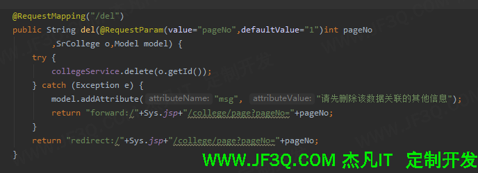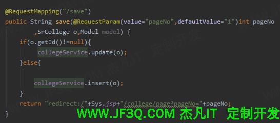 当表单提交请求/jsp/college/save,根基id是否为null,判断当前是添加还是编辑操作。Id为空表示添加,不为空表示更新,代码如下:
