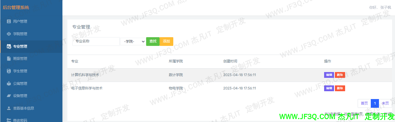 管理员可以对专业进行添加、编辑、删除和根据学院和选专业名称搜索,页面如下: