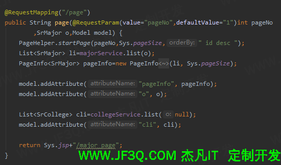 调用majorController.page()使用majorService.list()进行查询,使用pageHelper插件分页,由于页面上课根据学院查询,所以提前把所有的学院数据也查询出来。代码如下:
