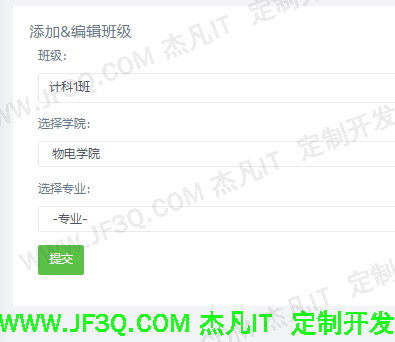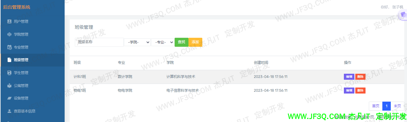 管理员可以对班级进行添加、编辑、删除和根据学院和专业、班级名称搜索,页面如下: