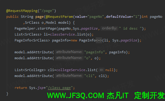调用classController.page()使用classService.list()进行查询,使用pageHelper插件分页,由于页面上课根据学院查询,所以提前把所有的学院数据也查询出来。代码如下: