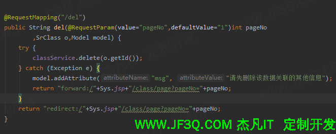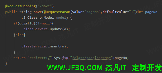 当表单提交请求/jsp/class/save,根基id是否为null,判断当前是添加还是编辑操作。Id为空表示添加,不为空表示更新,代码如下: