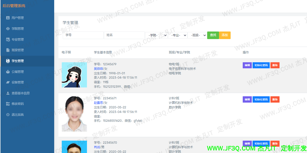 管理员可以对学生进行添加、编辑、删除和根据学院和专业、班级姓名等搜索,页面如下: