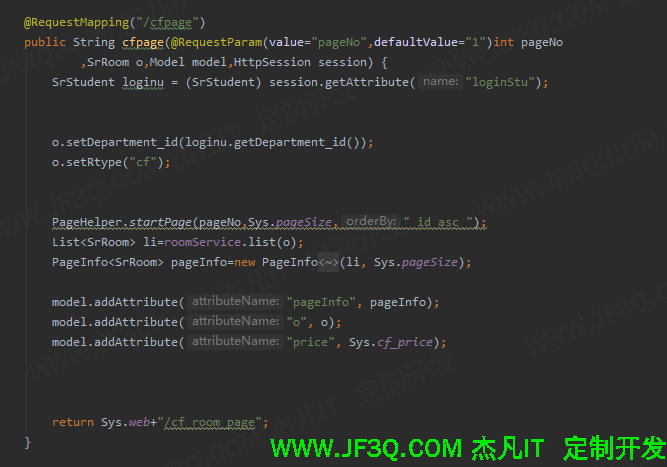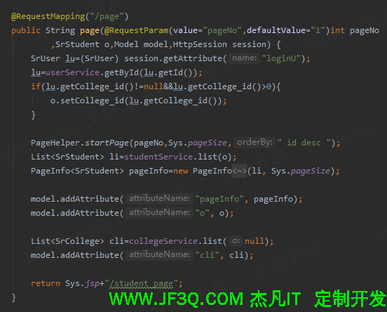 调用studentController.page()使用studentService.list()进行查询,使用pageHelper插件分页,由于页面根据学院查询,所以提前把所有的学院数据也查询出来。代码如下: