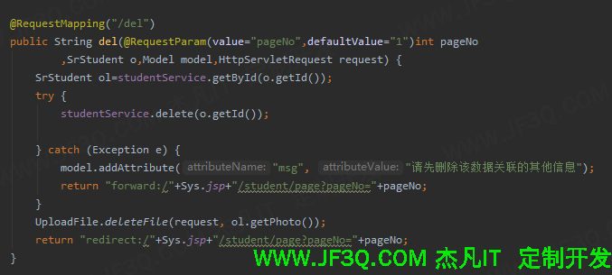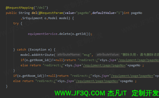 学生也可以删除该记录,请求/webequipmentFee/del?id=设备使用记录id,调用WebSrEquipmentFeeContrller.del()根据id删除。代码如下: