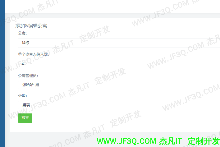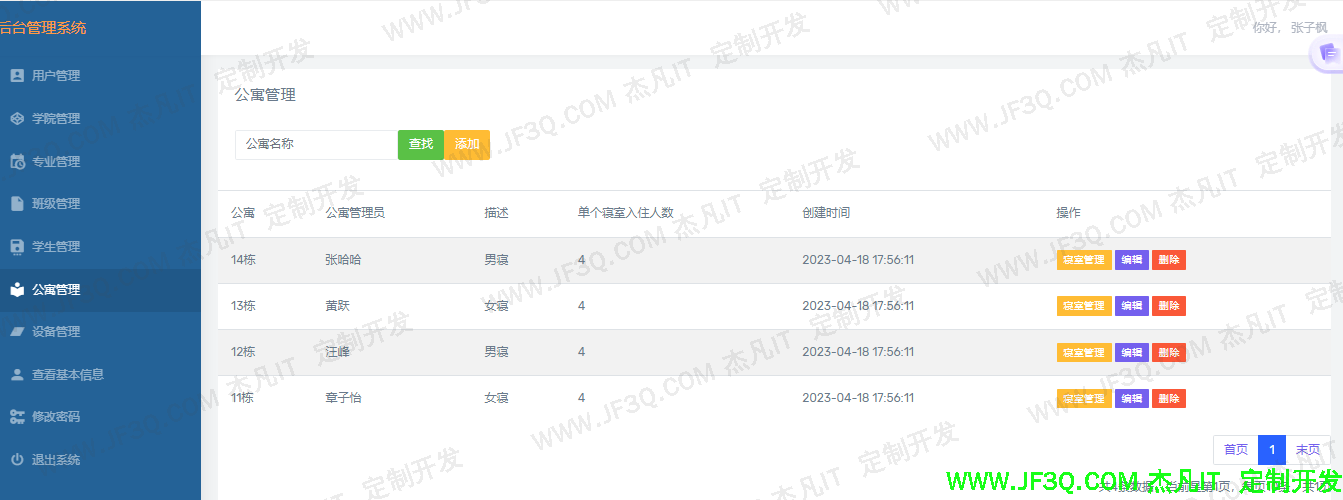 管理员可以对公寓进行添加、编辑、删除、搜索,同时也可以进行寝室房间管理和学生住寝分配。页面如下:
