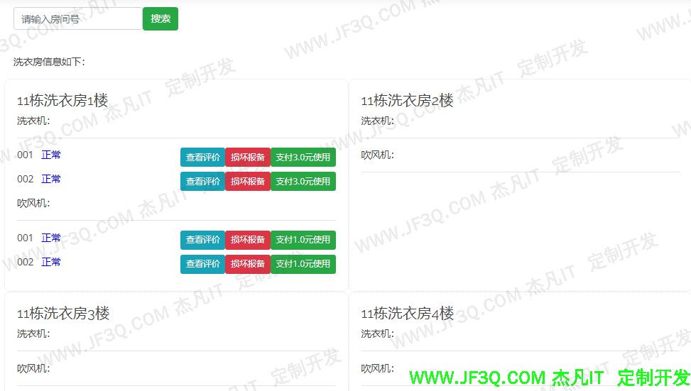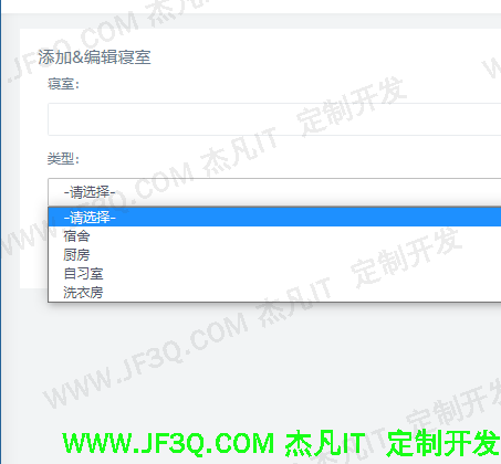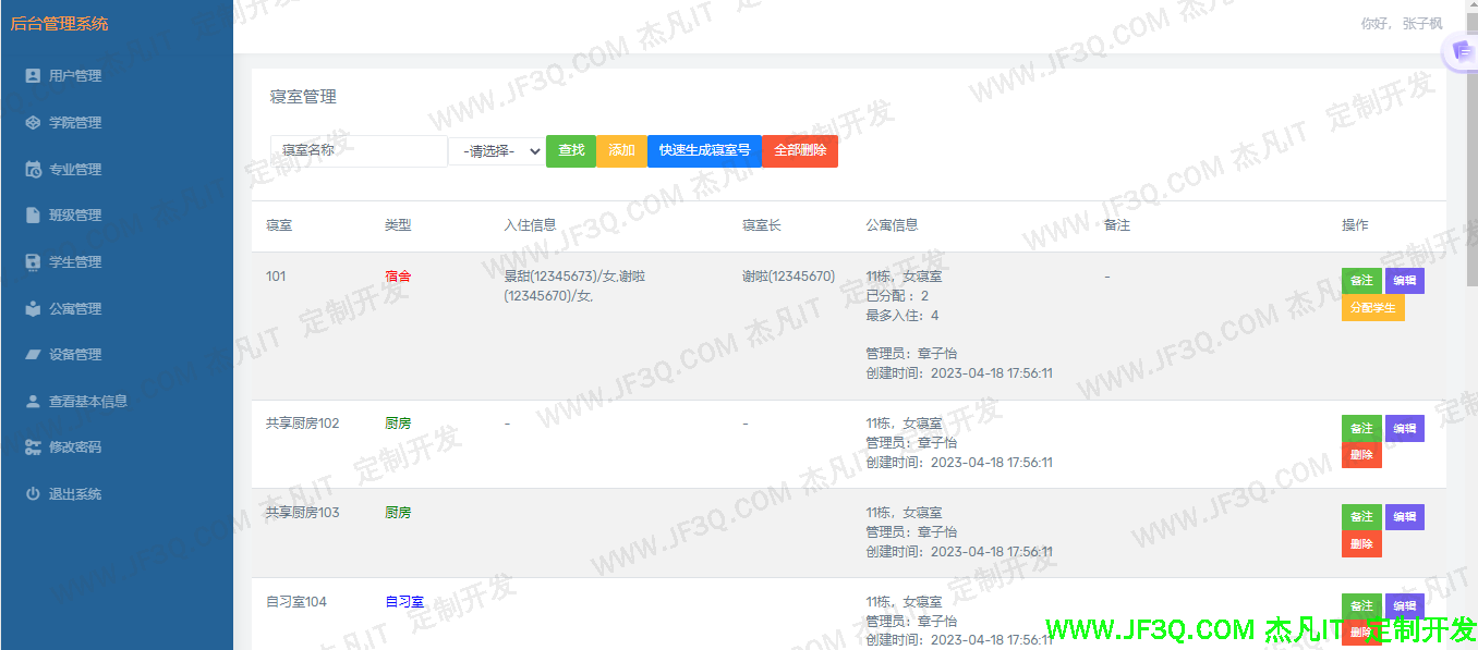 管理员可以快速生成房间,可以添加洗衣房,自习室,厨房,普通宿舍,一级给宿舍分配学生,页面如下: