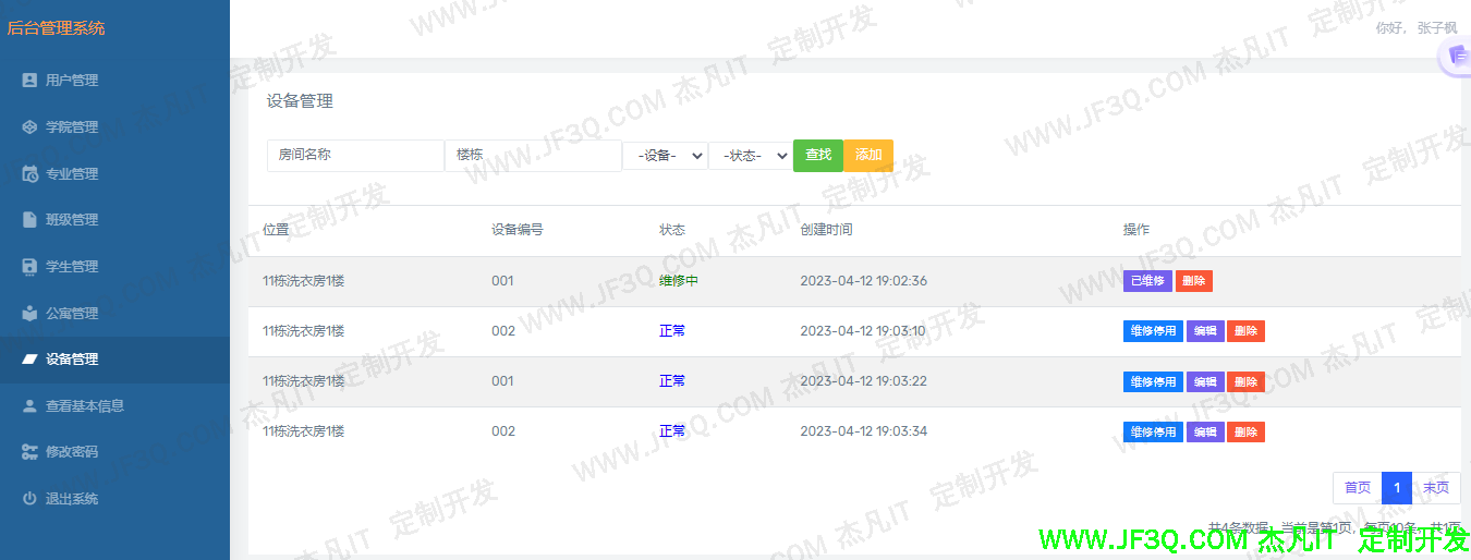 管理可以对电器设备能够进行添加、编辑、删除、维修搜索等操作,页面如下:
