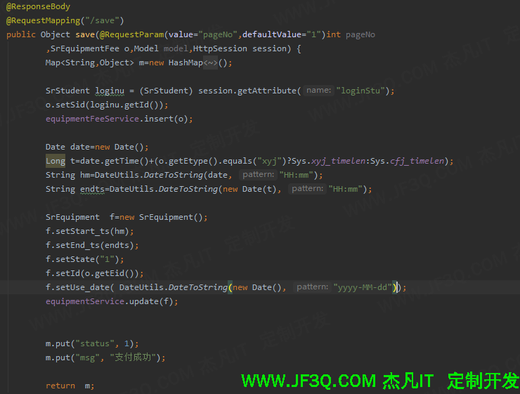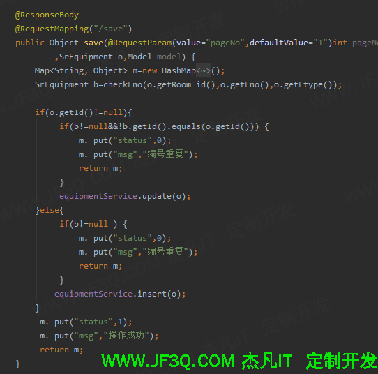 当表单提交请求/jsp/equipment/save,根基id是否为null,判断当前是添加还是编辑操作。Id为空表示添加,不为空表示更新,同时还要判断学号唯一性,代码如下: