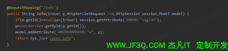 请求usersController.info()根据session获取用户id,调用usersService.getById()获取改用防护基本信息,返回前台。代码如下: