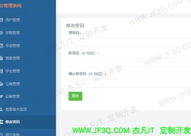 管理员功能包括:登录、用户管理、学院管理、专业管理、班级管理、学生管理、公寓管理、设备管理、个人基本信息、修改密码、退出登录。