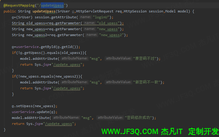 用户点击提交,表单请求路径/web/users/updateUpass,进入usersController.updateUpass()方法,根据session获取当前登陆的用户id,获取他的原密码对比输入是否正确。然后判断新密码是否一直,调用usersService.update()更新登录密码。代码如下: