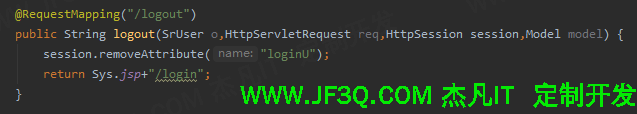 管理员点击退出登录按钮,页面将跳入登录页面,请求路径/web/users/logout,进入usersController.logout()方法,移除session里的user实体,代码如下: