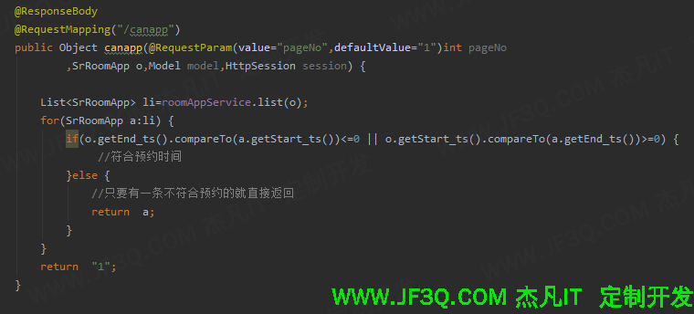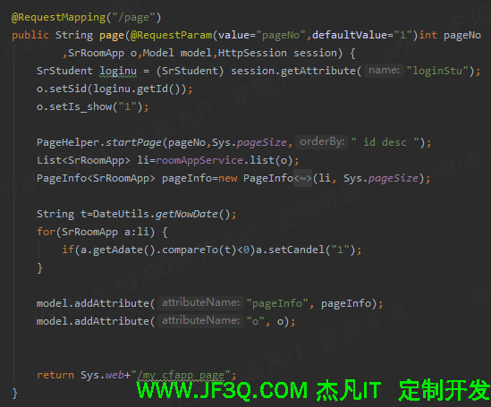 请求路径/web/roomapp/page,调用WebSrRoomappController.page(),根据session获取当前登录学生的id,调用roomappService.list()获取该学生的预约厨房的记录,使用pagehelper插件分页,由于预约具有时效性,只有使用过厨房后的学生才可以评价,所以遍历数据,根据使用结束时间判断该学生是否已结束预约,如果预约结束,则前台出现评价按钮。代码如下: