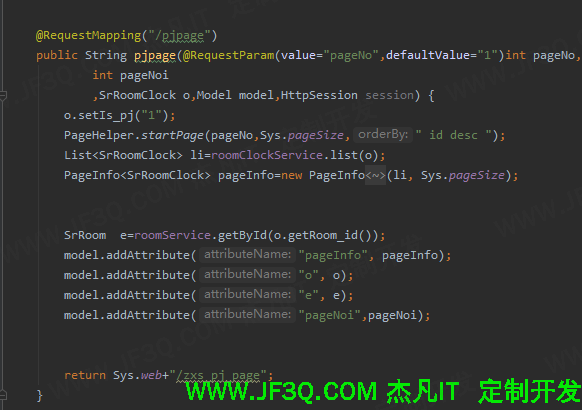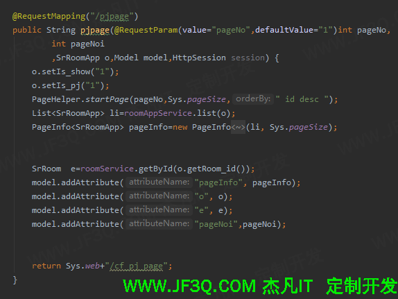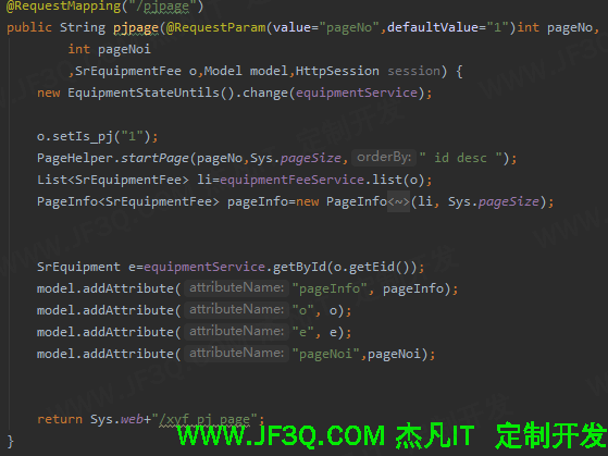 该页面请求实现原理,点击进入对应的WebSrEquipmentFeeController.pjpage()控制器,查询已经评价并且未删除的评价数据。is_pj表示评价状态:0待评价1已评价。调用EquipmentFeeService.lsit()查询,使用pagehelper插件分页。调用EquipmentSrtvice.getById()查询设备信息并展示到页面:代码如下: