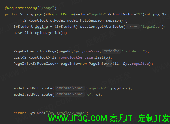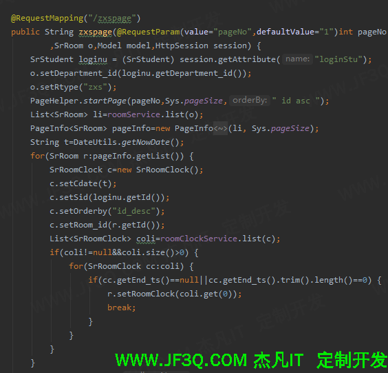 请求路径/web/roomclock/page,调用WebSrRoomclockController.page(),根据session获取当前登录学生的id,调用roomclockService.list()获取该学生的自习室打卡的记录,使用pagehelper插件分页。代码如下:
