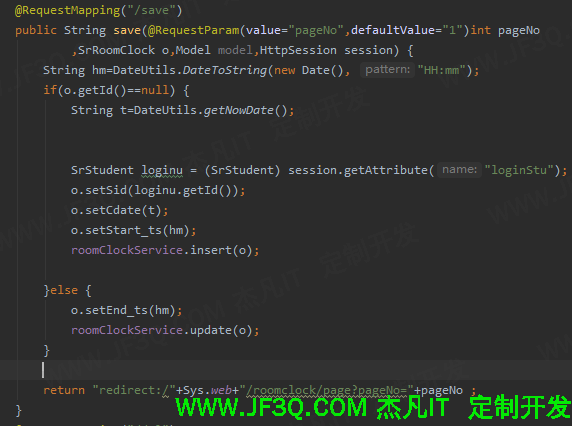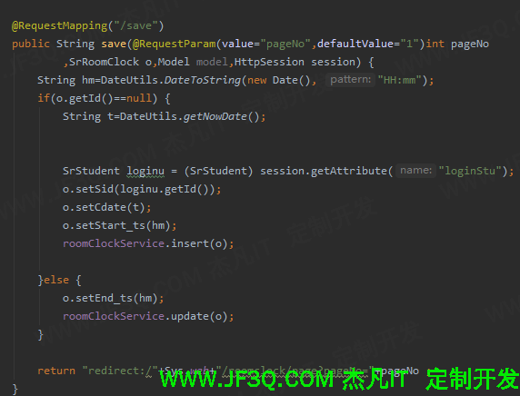 学生也可以点击“离开打卡”,记录自己的离开时间,请求web/roomclock/save?id=自习室打卡记录id,根据id不为空,设置离开时间并更新数据库,代码如下: