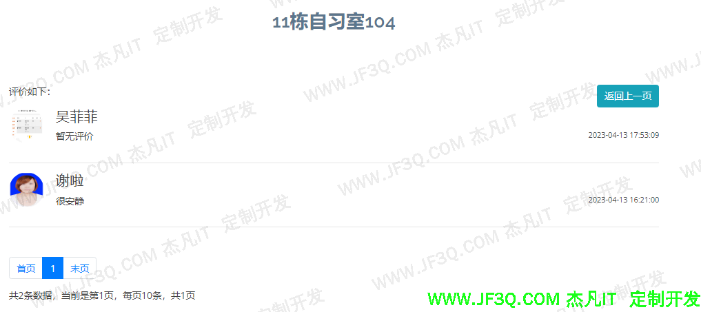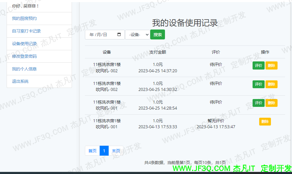 学生可以查看自己的设备使用记录,使用完自习室后可以进行评价或者删除。页面如下: