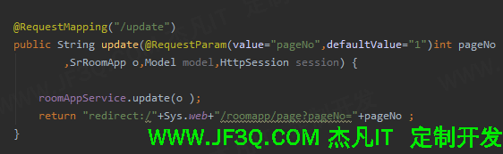 当学生输入评价建议后点击学的按钮,请求/web/roomapp/update?id=预约厨房记录id&pj=评价建议内容&is_pj=1,调用WebSrRoomappContrller.update()实现记录的更新,更改is_pj为1,代码如下:
