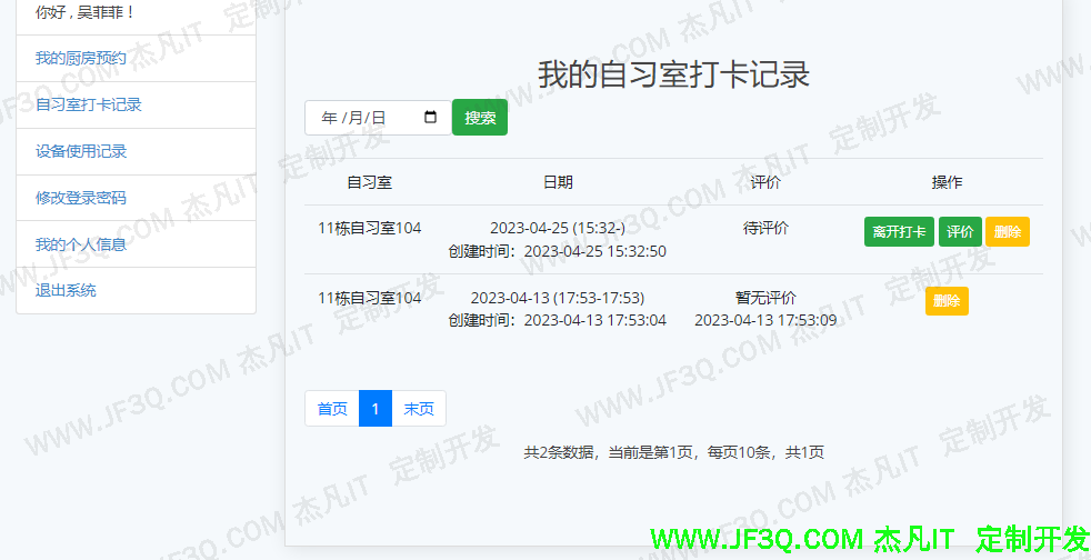学生可以查看自己的自习室打卡记录,并且可以点击离开打卡,使用完自习室后可以进行评价或者删除。页面如下: