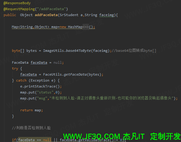 前端使用navigator.mediaDevices.getUserMedia(考虑个浏览器的内核差异,此处以最新的标准API:navigator.mediaDevices.getUserMedia为例)获取用户浏览器的摄像头并开启视频,使用canvas获取某一帧视频的图像,并转化成base64格式的图片,使用ajax传入后台采集人脸的接口/jsp/student/addFaceData。该接口主要调用虹软的人脸采集接口getFaceEngine()方法,获取该用户的脸部特征数据,并存入数据库。核心代码如下(宿管和学生采集的过程一样,此处以学生采集为例):