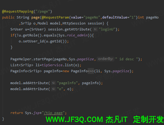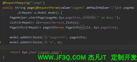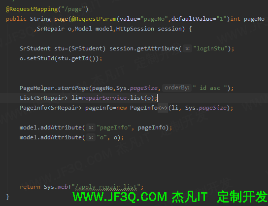 请求路径/jsp/repair/page,根据session获取当前登录的用户,而后根据该用户的role字段判断是管理员还是宿管,如果是宿管则根据宿管id查询他管理的寝室申请列表,管理员则查询所有列表 。调用repairService.list()配合pagehelper分页插件,查询分页数据并放入model传入jsp页面。代码如下: