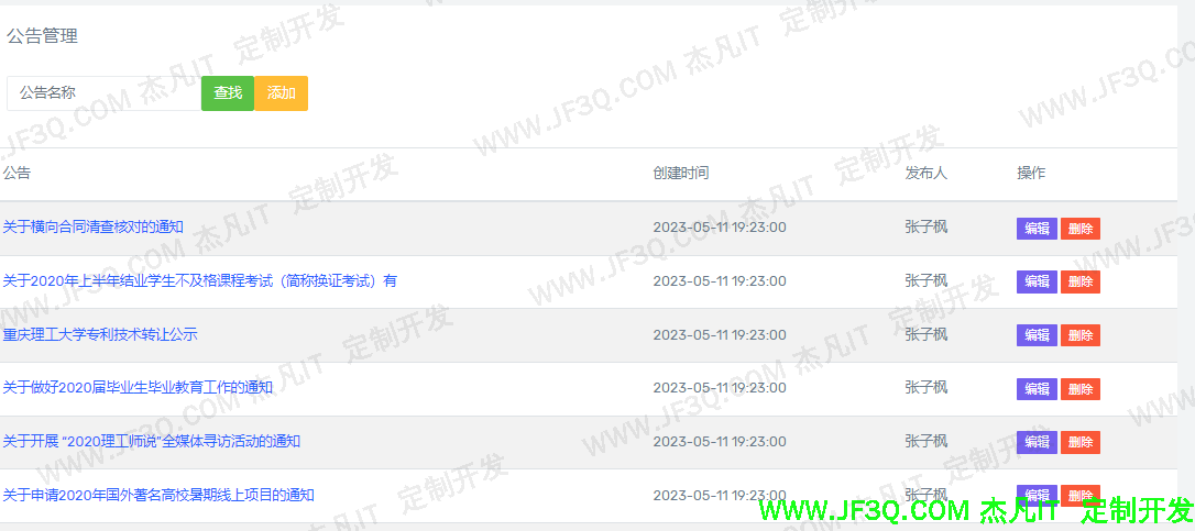 公告管理,根据session获取当前登录的用户,而后根据该用户的role字段判断是管理员还是宿管,如果是宿管则根据宿管id查询他自己发布的公告列表,管理员则查询所有列表 。调用tipService.list()查询数据,使用pagehelper插件分页实现。代码如下: