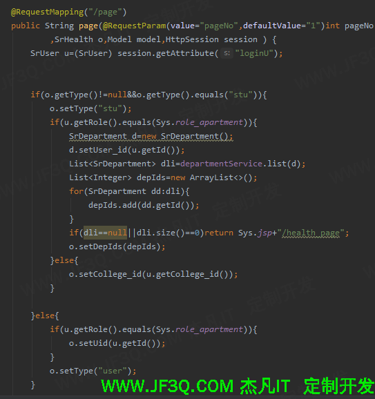 学生健康检测和宿管健康检测业务逻辑基本差不多,请求路径/jsp/health/page?type=类型,type=stu表示学生,type=user表示宿管。 此处以学生学生健康检测为例。根据session获取当前登录的用户,而后根据该用户的role字段判断是管理员还是宿管,如果是宿管则查询他所管理的公寓数,并放入list,而后使用in查询这些楼栋的学生健康数据,管理员则查询所有列表;如果是辅导员则根据辅导员的学院id查询该学院的学生健康数据查询条件根据role设定好后,调用healthService.list()获取健康检测数据,使用pagehelper插件分页和排序。代码如下: