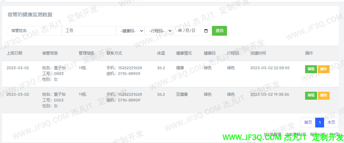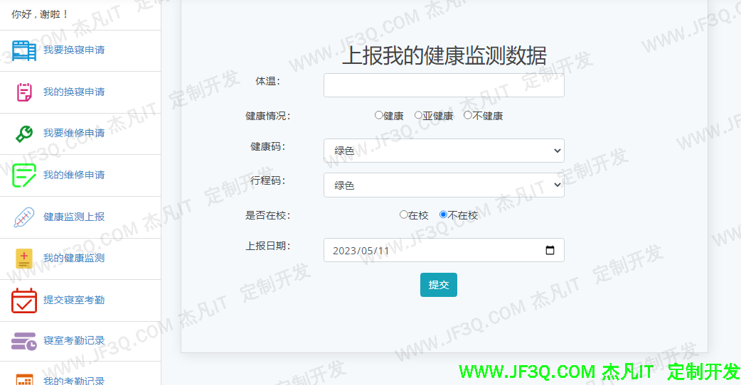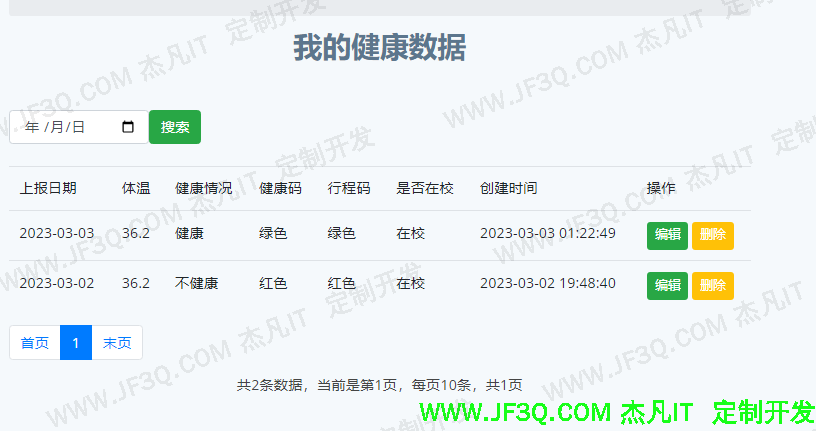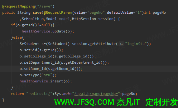 该功能主要使用使用form表单提交到/web/health/save,根据提交的id是否为空,判断学生是添加数据还是编辑。调用healthService.add()或者update()进行数据库的插入或者更新操作。代码如下: