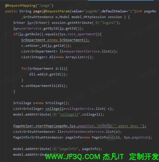 请求路径/jsp/stuAttendance/page。 根据session获取当前登录的用户,而后根据该用户的role字段判断是管理员还是宿管,如果是宿管则查询他所管理的公寓数,并放入list,而后使用in查询这些楼栋的学生考勤数据,管理员则查询所有学生的考勤;如果是辅导员则根据辅导员的学院id查询该学院的学生考勤数据查询条件根据role设定好后,调用inoutDepService.list()获取考勤数据,使用pagehelper插件分页,根据id倒叙排序。代码如下: