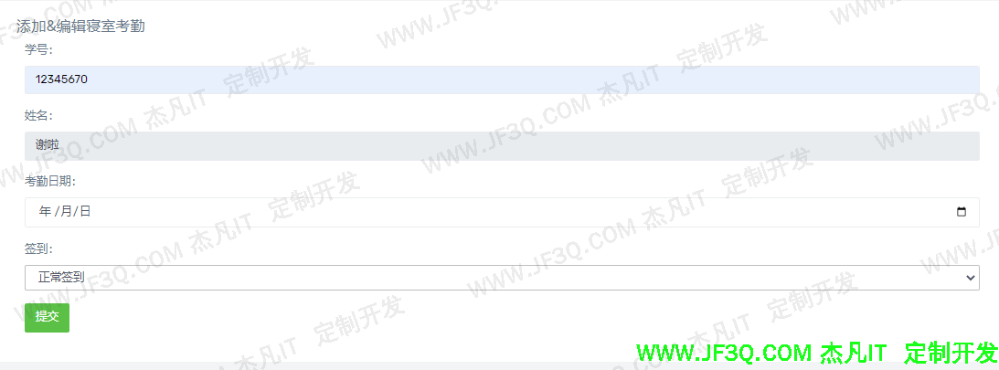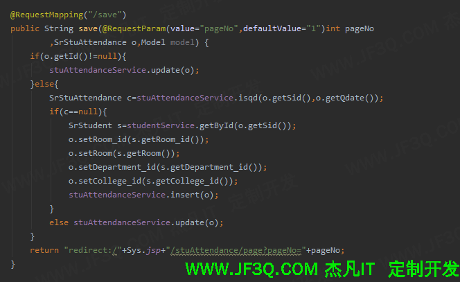 宿管还可以手动添加某一学生的考勤信息,在input输入某学生的学号,使用ajax请求查询查询该学生,点击提交按钮提交form表单至/jsp/stuAttendance/save,调用stuAttendanceService.isqd判断该学是否已提交签到信息,以免重复提交。若察隅结果为null则调用stuAttendanceService.insrt()方法保存该学的考勤数据到数据库。代码如下: