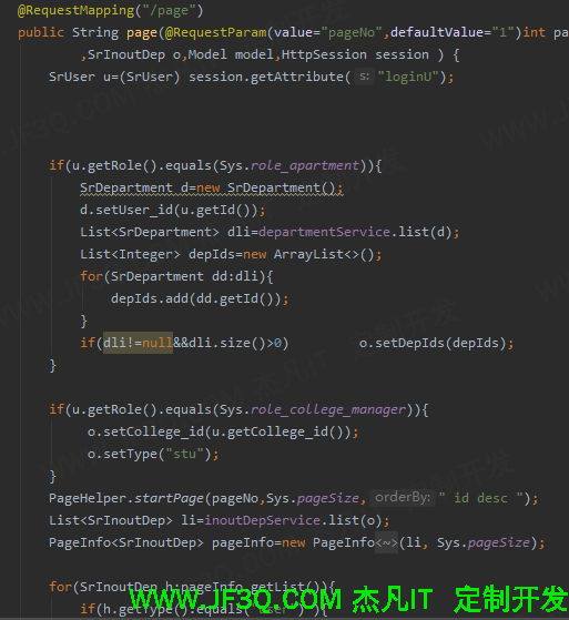 请求路径/jsp/inoutDep/page。 根据session获取当前登录的用户,而后根据该用户的role字段判断是管理员还是宿管,如果是宿管则查询他所管理的公寓数,并放入list,而后使用in查询这些楼栋的学生出入记录数据,管理员则查询所有学生和宿管的出入记录;如果是辅导员则根据辅导员的学院id查询该学院的学生出入记录数据。查询条件根据role设定好后,调用inoutDepService.list()获取考勤数据,使用pagehelper插件分页和排序。代码如下: