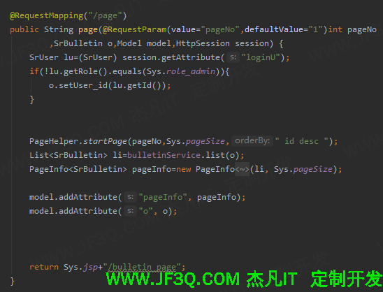 请求路径/jsp/bulletin/page,根据session获取登录用户的身份,若不是超级管理员则根据登录用户的id查询,管理员则查询所有通告。调用bulletionService.list查询,使用pagehelper插件分页。代码如下: