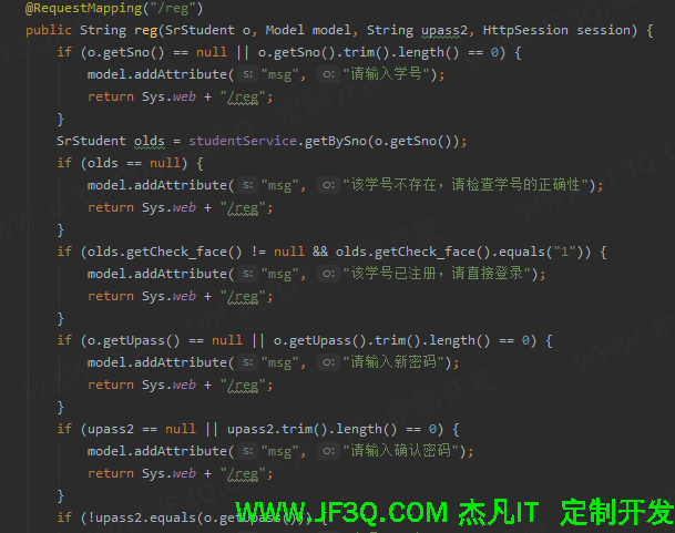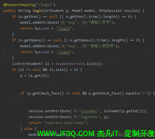 学生灯枯和用户登录一样,军事form表单提交账号密码后台查询数据库,已学生登录为例,表单提交至/web/student/login,调用studentService.list()判断返回结果,若返回结构为空则表示登录失败,否则将该学生存入session,登录成功跳转个人中心页面。代码如下:
