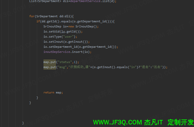 进入和出去宿舍楼栋的刷脸逻辑一样,此处使用inout来表示,in表示进入,out表示出去。前端同样使用navigator.mediaDevices.getUserMedia开启用户浏览器的摄像头。生成用户脸部图片,调用/jsp/inoutDep/faceadd?inout=进出类型&department_id=宿舍楼栋id控制器,使用虹软人脸比对接口faceEngine.detectFaces()方法,将刚采集的用户人脸图片转化成人脸特征数据,并于数据库里已采集的学生宿舍脸部特征数据循环对比,根据特征相似值判断进出人的身份。该相似值推荐0.8以上,以此提高识别度。代码如下: